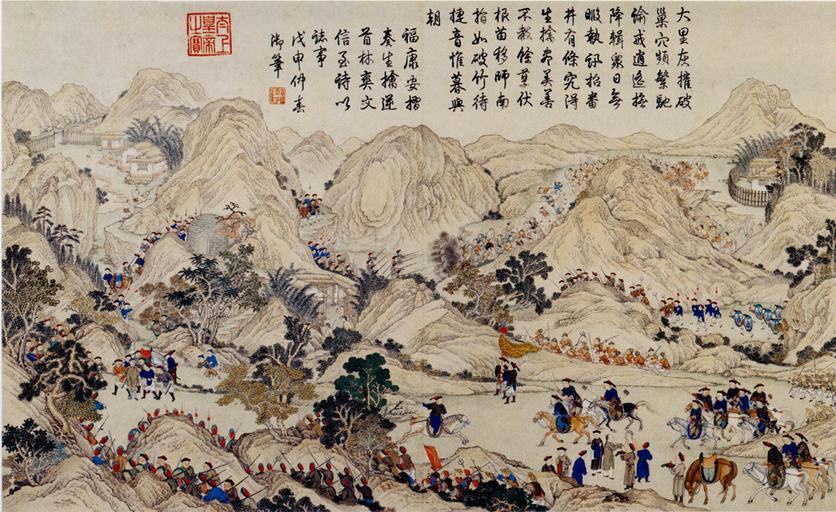 | Keywords: Capture of the rebel chief Lin Shuangwen.jpg zh 清乾隆㠊平定臺ç£å¾—å‹ å –ã ‹ä¹‹ã Šç”Ÿæ“’é †é¦–æž—çˆ½æ–‡ã ‹ã ‚ en Capture of the rebel chief Lin Shuangwen a scene of the Taiwanese campaign 1787-1788 http //www battle-of-qurman com cn/e/hist htm late XVIII century A collaboration between Chinese and European painters The Jesuit missionaries involved in producing the drawings in China were Giuseppe Castiglione Jean-Denis Attiret Ignace Sichelbart and Jean Damascene The engravings were executed in Paris under the direction of Charles-Nicolas Cochin of the Académie Royal at the Court of Louis XVI and the individual engravers include Le Bas Aliamet Prevot Saint-Aubin Masquelier Choffard and Launay PD-Art Military of Qing China Ten Great Campaigns Paintings of the Qing Dynasty |