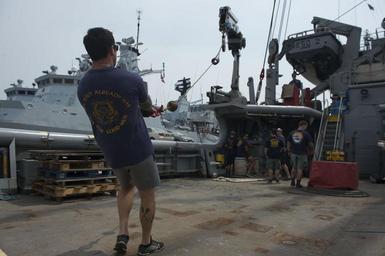 | Keywords: CARAT 2014 140620-N-NT265-011.jpg en Navy Diver 1st Class Joshua Amburger assigned to Mobile Diving Salvage Unit 1 Company 1-5 assists in stowing the Morgan crane aboard the Military Sealift Command rescue and salvage ship USNS Safeguard Safeguard and its embarked MDSU is conducting dive exercises with the Royal Malaysian navy during Cooperation Afloat Readiness and Training 2014 In its 20th year CARAT is a bilateral exercise series between the United States and the armed forces of the nine partner nations in South and Southeast Asia 2014-06-20 MDSU https //www dvidshub net/image/1420535 140620-N-NT265-011 2014-06-26 01 21 DINDING RIVER MY PD-USGov-Military-Navy Cooperation Afloat Readiness and Training 2014 Images from DoD uploaded by Fæ |