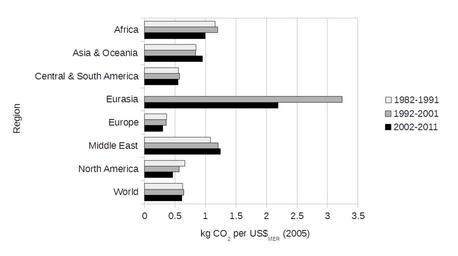 | Keywords: Carbon intensity of GDP (using MER) for different regions, 1982-2011 (corrected).png gross domestic product GDP for different regions between the years 1982 and 2011 Carbon intensity of GDP is defined as annual carbon dioxide emissions divided by annual GDP Carbon dioxide emissions are measured in kilograms GDP is measured in US dollars year 2005 values using market exchange rates MER The regions are Africa Asia and Oceania Central and South America Eurasia Europe the Middle East North America and the world These regional groupings are defined in File Carbon intensity of GDP using PPP for different regions 1982-2011 png Regions Three carbon intensity values are given for each region which are averaged over the years 1982 to 1991 1992 to 2001 and 2002 to 2011 Data are given in a later section Intensities show variations regionally and over time Global carbon intensity has on average fallen over this time period own Enescot 2014-11-16 Data International data for carbon dioxide emissions from the consumption of energy include emissions due to the consumption of petroleum natural gas and coal and also from natural gas flaring These data do not include emissions from geothermal power generation cement production and other industrial process or municipal solid waste combustion - http //www eia gov/cfapps/ipdbproject/docs/IPMNotes html ind Notes for International Energy Statistics archived https //web archive org/web/20140704234711/http //www eia gov/cfapps/ipdbproject/docs/IPMNotes html ind 4 July 2014 wikitable sortable - 1982-1991 1992-2001 2002-2011 - World 0 62820 0 64144 0 61048 - North America 0 662487 0 565959 0 463743 - Middle East 1 081453 1 206009 1 242052 - Europe 0 363907 0 358704 0 299303 - Eurasia NA 3 24069 2 191531 - Central South America 0 557418 0 577031 0 548624 - Asia Oceania 0 844085 0 837025 0 950607 - Africa 1 157569 1 198533 0 994154 Global warming graphs Greenhouse emissions Cc-zero |