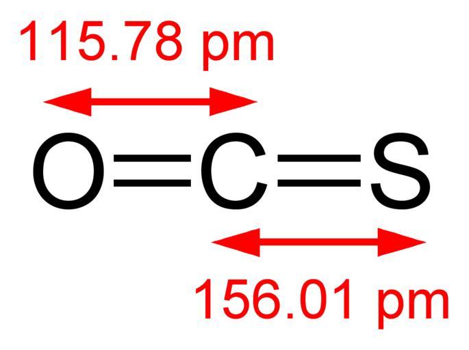 | Keywords: Carbonyl-sulfide-2D-dimensions.png Structure of the carbon disulfide molecule OCS with the C S bond length of 1 5601 Å and the C O bond length of 1 1578 Å Data from http //www hbcpnetbase com/ CRC Handbook of Chemistry and Physics 88<sup>th</sup> edition Own 2008-06-11 Ben Mills Benjah-bmm27 Images by Ben Mills Carbonyl sulfide |
