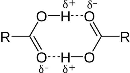 Keywords: Carboxylic acid dimers.svg en Chemical structure of carboxylic acid dimers with partial charges own Panoramix303 Hydrogen bonding Carboxylic acids Dimers