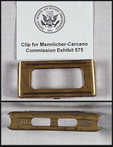 | Keywords: Carcanoclip.jpg Brass clip from Lee Harvey Oswald's Mannlicher-Carcano rifle in the collection of the US National Archives NARA-image PD-USGov Original upload log en wikipedia Carcanoclip jpg wikitable - 2006-01-19 04 13 391×508× 51053 bytes Mytwocents <nowiki>Brass clip from Lee Harvey Oswald's Mannlicher-Carcano rifle in the collection of the US National Archives PD-USGov-NARA </nowiki> En-bloc clips | ||||