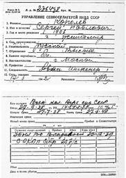 | Keywords: Card of the prisoner in the Office of the north-eastern camps of the NKVD with record about Korolev. June 17, 1942.png en Card of the prisoner in the Office of the north-eastern camps of the NKVD with record about Korolev June 17 1942 ru Ка точка учета заключенных в Уп авлении севе о-восточных лаге ей КВД СССР с записью о С П Ко облеве 17 июня 1942 г 1942-06-17 Soviet archives USSR other versions Custom license marker 2016 07 01 PD-old-70 Sergei Korolyov | ||||