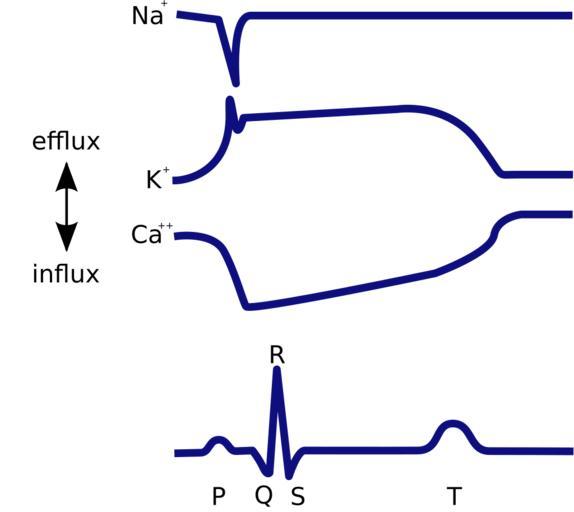 Keywords: Cardiac cycle ions related to ECG.svg en Relative ion flow in the cardiac cycle as it relates to features of the ECG/EKG PQRST waves own Buxtor 2010-03-08 Ions ECG principle