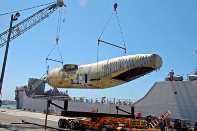| Keywords: Cargo loading trainer 090722-N-MQ132-040.jpg en The fuselage of a giant C-17 cargo aircraft is lifted onto the Army transport ship SSGT Robert T Kuroda LSV-7 at the Seal Beach Naval Weapons Station The 170-foot-long 25-foot-high aircraft shell will be transported to the U S Army Transportation School at Fort Lee VA to be used as a cargo loading trainer U S Navy photo by Gregg Smith/Released 2009-07-22 Rear Adm Gregg Smith https //www dvidshub net/image/1277419 090722-N-MQ132-040 2014-04-26 10 19 US PD-USGov-Military-Navy Fort Lee Virginia Images from DoD uploaded by Fæ |