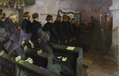 | Keywords: Carl Bantzer - Abendmahlsfeier in Hessen (1892).jpg Artwork creator Carl Bantzer 1892 oil canvas cm 160 249 Universitätsmuseum für Kunst und Kulturgeschichte accession number 6191 object history Staatliche Museen zu Berlin Ankauf 1899<br/>Universitätsmuseum für Kunst und Kulturgeschichte Marburg Leihgabe seit 1934 <br/>Erworben 1968 exhibition history credit line C N Bantzer Willingshsn 1892 ~ lower left signature / date Frauen in Schwälmer Abendmahlstracht 00001042 <gallery>File Das Abendmahl jpg langSwitch a study Studie zur žAbendmahlsfeier in Hessen 1891 </gallery> PD-old-auto-1923 1941 DEFAULTSORT Bantzer Carl; Souper in Hesse 1892; Universitätsmuseum für Kunst und Kulturgeschichte Carl Bantzer Universitätsmuseum für Kunst und Kulturgeschichte Weimar Lahn Wehrkirche Wenkbach Eucharist in art 19th-century religious paintings Images from Bildarchiv Foto Marburg |
