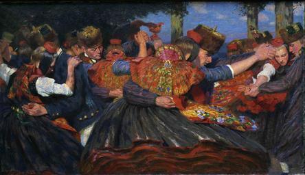 | Keywords: Carl Bantzer Schwälmer Tanz 1897 1898.jpg Artwork creator Carl Bantzer 1898 oil canvas cm 97 5 167 2 Universitätsmuseum für Kunst und Kulturgeschichte accession number 220 00011494 object history exhibition history 1899 Dresden<br/>1899-1900 Paris Weltausstellung im Grand Palais credit line C Bantzer 1898 ~ lower left signature / date http //www kunst-braucht-raum net/ PD-old-auto-1923 1941 Carl Bantzer Universitätsmuseum für Kunst und Kulturgeschichte Paintings of dancing couples 1890s paintings in Hesse 1898 in dance |
