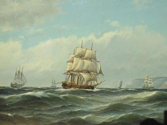 | Keywords: Carl Bille - Skibe ut fra Norge.jpg Artwork Creator Carl Bille Skibe ut fra Norge a three-masted fullrigged sailing ship in the foreground and four vessels in the background a Brig and a Sailing Cutter on the right a Dutch sailing steamer behind the foreground ship and Danish frigate on the left side 1889 oil canvas cm 42 63 object history credit line accession number http //www fineartemporium com/se-Bille-CL htm www fineartemporium com PD-old-100 Carl Bille 19th-century sailing ships in paintings 1889 paintings 19th-century paintings location missing |
