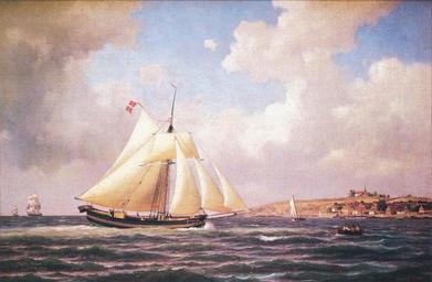 | Keywords: Carl Bille - Urban af Svaneke - 1860.jpg en Tradition says that captain Lund of the Urban presented this painting to Olivia Olsen of Gudhjem as an engagement gift showing both the ship and Gudhjem Oil on canvas size 63 x 95 cm Bornholms Museum Rønne Source Hanne Poulsen Danske Skibsportrætmalere page 62 Carl Bille painting scanned from book creator Carl Bille 1860 PD-old-100-1923 Oil marine paintings by Carl Bille Bornholm in art Gudhjem Ships of Denmark in art Urban | ||||