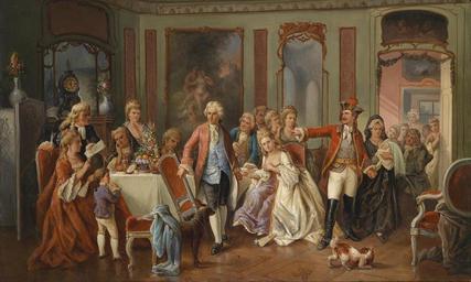 | Keywords: Carl Herpfer (circle) Überraschter junger Vater.jpg à berraschter junger Vater im Kreise einer eleganten Gesellschaft Öl auf Leinwand 50 x 81 5 cm http //www dorotheum com Dorotheum century 19 circle of Carl Herpfer 1836-1897 PD-art-100 Images from Dorotheum Carl Herpfer Rococo revival paintings Mothers and children in art |
