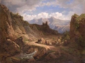 | Keywords: Carl Maria Nicolaus Hummel - Südliche Berglandschaft mit Burgruine.jpg Artwork Creator Carl Hummel Ansicht einer felsigen alten Passstraße die über eine Steinbrücke führt darunter ein rauschender Gebirgsbach Im Hintergrund dreitürmige Burgruine auf dem Weg Wanderer mit Hund Dahinter von der Sonne beleuchteter Gebirgszug unter Wolkenhimmel 1824-06 Not possible He was only three years old at the time oil canvas cm 44 58 5 accession number object history credit line Juni 1824 ~ lower left monogram and date 1874 perhaps http //www hampel-auctions com/de/archive-artists/h/1767 html Hampel Auctions 2008 07 04 lot 547 PD-art-100 Carl Hummel Images from Hampel Auctions |