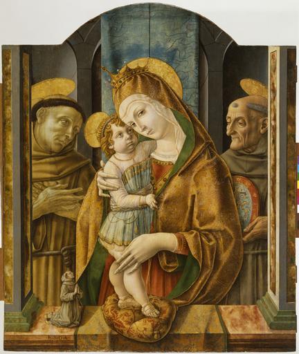 | Keywords: Carlo Crivelli - Madonna and Child with Saints and Donor - Walters 37593.jpg Mary's crown and the elegance of her dress reinforce the status of the embracing Virgin and Child as Queen and King of Heaven The unknown donor-the little figure in the lower left corner-belonged to the Franciscan Order founded by St Francis of Assisi The initials FBDA might stand for Fra Bernardino da Ancona Brother Bernardino of Ancona St Francis is standing to the left of the Madonna and Child and on the right is another Franciscan St Bernadino of Siena holding his attribute the plaque inscribed with Christ's initials surrounded by the rays of the sun This altarpiece was almost certainly made for a private oratory or chapel in a convent in the Marches eastern-central Italy where Crivelli was active The panel displays Crivelli's original style of employing sharp outlines splendid surface textures and striking illusionist effects such as the cushion on which Christ stands that seems to extend into the viewer's space Zeri Italian paintings in the Walters Art Gallery 163 242-243 ca 1485 1490 Renaissance tempera oil panel Painted surface H 38 9/16 x W 32 3/16 x D excluding cradle 9/16 in 98 x 81 8 x 1 5 cm accession number 37 593 33328 Don Marcello Massarenti Collection Rome prior to 1897 mode of acquisition unknown 1897 catalogue no 397 Henry Walters city Baltimore Walters Art Museum Henry Walters Acquired by Henry Walters with the Massarenti Collection 1902 Transcription Inscribed in the lower left F B D A God's Minstrel St Francis of Assisi The Walters Art Gallery Baltimore 1982 The Taste of Maryland Art Collecting in Maryland 1800-1934 The Walters Art Gallery Baltimore 1984 place of origin Marche Italy Walters Art Museum license 2D Italian Renaissance paintings in the Walters Art Museum Madonnas by Carlo Crivelli Paintings in the Walters Art Museum Eleusa |