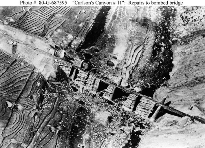 | Keywords: Carlson's Canyon.jpg en Photograph Carlson's Canyon 11 taken on 30 March 1951 showing the bridge repaired with wooden cribbing It lacks only rails to be ready for service again The bridge was originally knocked out by Navy carrier planes on 3 March was repaired and again put out of service by air strikes on 15 March and would be revisited and totally destroyed on 2 April This railway bridge-tunnel complex was located south of Kilchu in northeastern Korea http //www history navy mil/photos/images/g600000/g687595c htm Official U S Navy Photograph no 80-G-687595 now in the collections of the National Archives USN 1951-03-30 PD-USGov-Military-Navy PD-USGov-Military-Navy Korean War Box cribs |