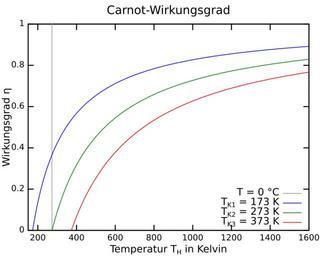 | Keywords: Carnot Wirkungsgrad.svg de Carnot-Wirkungsgrad <math>\eta 1 - \frac T_\text K T_\text W </math> 2014-05-16 21 52 31 own Menner Inkscape cc-zero Source code GNU Octave <syntaxhighlight lang octave > Diagramm Carnot-Wirkungsgrad Menner 2014 Titel Carnot-Wirkungsgrad ; Text_eta Wirkungsgrad η ; T_W 150 10 1600; 140 Werte Text_T_W Temperatur TH in Kelvin ; T_K1 173 T_K2 273 T_K3 373; Text_T_K1 TK1 173 K ; Text_T_K2 TK2 273 K ; Text_T_K3 TK3 373 K ; T_W_multi T_W; T_W; T_W; eins_multi ones; eta 1-T_K/T_W eta_1 1 - T_K1 /T_W; eta_2 1 - T_K2 /T_W; eta_3 1 - T_K3 /T_W; eta eta_1; eta_2; eta_3; size eta ylim 0 1 plot 273 273 ylim color k linewidth 1 ; 0°C Linie hold on ; plot T_W; T_W; T_W' eta' linewidth 1 ylim 0 1 ; xlim min T_W max T_W ; title Titel fontsize 14 ; xlabel Text_T_W fontsize 12 ; ylabel Text_eta fontsize 12 ; legend_set legend T 0 °C Text_T_K1 Text_T_K2 Text_T_K3 location southeast ; set legend_set fontsize 12 ; grid ; set gca linewidth 1 5 ; printf Weiter mit beliebiger Taste\n ; pause; print carnot_wirkungsgrad svg -dsvg -S1000 800 </syntaxhighlight> Uploaded with UploadWizard Carnot cycle |