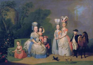 | Keywords: Carolina van Oranje-Nassau by Anton Wilhelm Tischbein.jpg Artwork Q17275893 Creator Anton Wilhelm Tischbein Guillaume de Spinny LangSwitch Portrait of Carolina Wilhelmina of Orange 1743-1787 and her children Portret van Carolina Wilhelmina van Oranje 1743-1787 en haar kinderen Karoline Prinzessin von Oranien-Nassau-Diez 28 Februar 1743 in Leeuwarden; 6 Mai 1787 in Kirchheimbolanden eine Tochter des Prinzen Wilhelm IV von Oranien und Prinzessin Anne Princess Royal und Prinzessin von Oranien 1709-1759 älteste Tochter des britischen Königs und Braunschweiger Kurfürsten Georg II die als 17-jährige am 5 März 1760 in Haag den 25-jährigen Karl Christian von Nassau-Weilburg heiratete Das Ehepaar Karl Christian und Karoline hatten 16 Kinder von denen diese sechs überlebten Alternate titles ~ 1777-1778 Oil on canvas cm 104 5 149 Institution Mauritshuis accession number 232 object history loan LangSwitch das the au het Oranje-Nassau Museum LangSwitch die the le het Mauritshuis The Hague by 2011 Mauritshuis The Hague credit line 24579 www geheugenvannederland nl http //www geheugenvannederland nl/ /en/homepage Home http //www geheugenvannederland nl/ /en/items/MAU01 0232/ Info http //resources21 kb nl/gvn/MAU01/MAU01_0232_W JPG Pic PD-old-100 LangSwitch ~ Noten <references /> Anton Wilhelm Tischbein 18th-century portrait paintings in the Mauritshuis 1777c German paintings in the Mauritshuis Tischbein Anton Wilhelm Carolina of Orange-Nassau 1777c 1777 portrait paintings M 18th-century family portraits of royalty 1777c 18th-century people of the Netherlands 1777c 18th-century portrait paintings with dogs 1777c 18th-century portrait paintings with horses 1777c 18th-century portraits in military uniforms 1777c Female hair fashion in art Group portraits with 7 persons Family portraits with horses Portraits of mothers with children 1777c Portraits wearing tricorne hats 1777c |