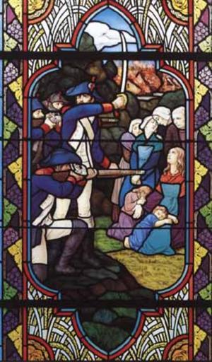 | Keywords: Carrefour des chats.jpg en Stained glass window of the Saint-Martin church in La-Salle-de-Vihiers presenting the massacre of Carrefour-des-chats in 1794 when the French republican army shot over thirty villagers including women and children fr Église de La-Salle-de-Vihiers Maine-et-Loire France Vitrerie de Desjardins entre 1931 et 1939 Fusillade d'une trentaine d'habitants par les républicains au Carrefour des Chats http //www loire-france com/histoire/guerres-vendee/vitraux/galerie/pages/vitrail-096 htm Desjardins 1931 The picture represents a work of art whose author died over 70 years ago cca 1934 PD-old La Salle-de-Vihiers Colonnes infernales War of Vendée on stained glass windows Stained glass windows in Maine-et-Loire 1931 stained glass windows |