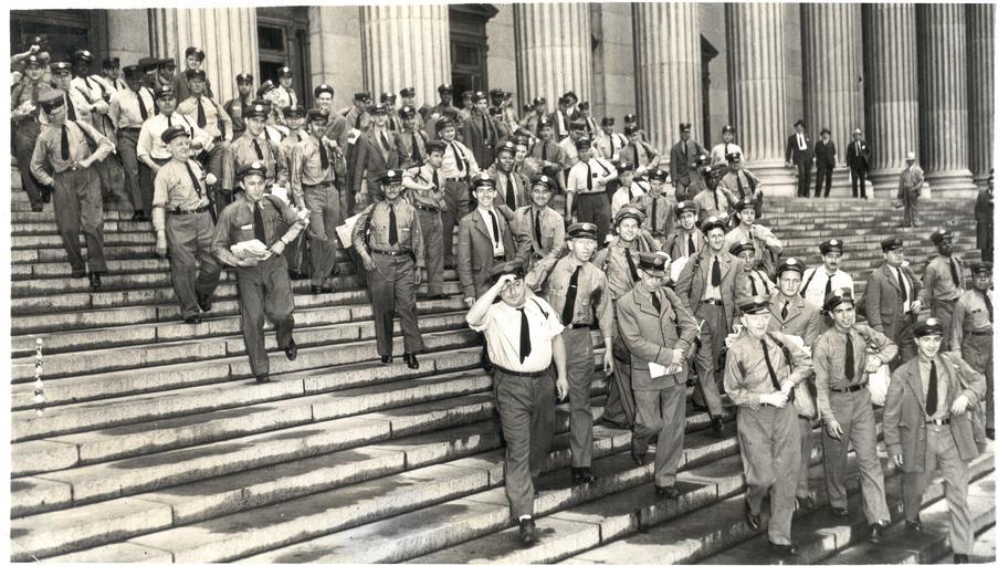 | Keywords: smithsonian institution smithsonianinstitution mail carriers mailcarriers new york city newyorkcity june 1936 june1936 1936 bonus army bonusarmy post office postoffice postal uniforms postaluniforms mid-20th century mid20thcentury group men outdoors steps postal workers postalworkers america world war i worldwari salute uniform collumns bus drivers busdrivers capitol national postal museum nationalpostalmuseum mail across the commons mailacrossthecommons Description: Dozens of carriers leaving the main city post office building in New York City on June 15, 1936. Among the items carriers had in their mailbags for delivery that day were the first "bonus army" checks. The "bonus army" were World War I veterans who demonstrated in Washington, D.C. in 1932 for more rapid payment of their Service Certificate payments. The veterans received cashable bonds in 1936. Creator/Photographer: Unidentified photographer Medium: Black and white photographic print Culture: American Geography: USA Date: 1936 Collection: U.S. Postal Employees Repository: National Postal Museum Accession number: A.2008-23 Persistent URL: arago.si.edu/index.asp?con=2&cmd=1&id=194375 View more collections from the Smithsonian Institution. Description: Dozens of carriers leaving the main city post office building in New York City on June 15, 1936. Among the items carriers had in their mailbags for delivery that day were the first "bonus army" checks. The "bonus army" were World War I veterans who demonstrated in Washington, D.C. in 1932 for more rapid payment of their Service Certificate payments. The veterans received cashable bonds in 1936. Creator/Photographer: Unidentified photographer Medium: Black and white photographic print Culture: American Geography: USA Date: 1936 Collection: U.S. Postal Employees Repository: National Postal Museum Accession number: A.2008-23 Persistent URL: arago.si.edu/index.asp?con=2&cmd=1&id=194375 View more collections from the Smithsonian Institution. |