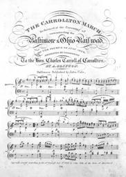 | Keywords: Carrollton March 1828.png en Sheet music for the first known train song which was copyrighted July 1 1828 and was written to commemorate the groundbreaking of the Baltimore Ohio Railroad three days later The piece is named for Charles Carroll of Carrollton Maryland the last surviving signer of the Declaration of Independence who laid the first stone for railroad's construction 1828-07-01 https //jscholarship library jhu edu/handle/1774 2/31154 Arthur Clifton PD-old-70-1923 Uploaded with UploadWizard Sheet music Marches |