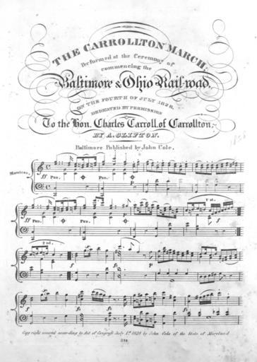 Keywords: Carrollton March 1828.png en Sheet music for the first known train song which was copyrighted July 1 1828 and was written to commemorate the groundbreaking of the Baltimore Ohio Railroad three days later The piece is named for Charles Carroll of Carrollton Maryland the last surviving signer of the Declaration of Independence who laid the first stone for railroad's construction 1828-07-01 https //jscholarship library jhu edu/handle/1774 2/31154 Arthur Clifton PD-old-70-1923 Uploaded with UploadWizard Sheet music Marches |