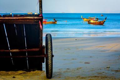 Keywords: cart wheel sand beach blue g0lden yellow ocean sea water boat rust red trip azure ao nang thailand