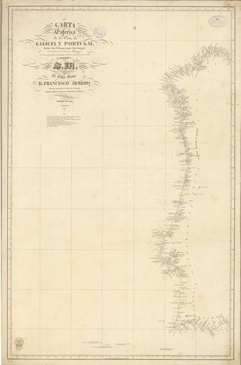 | Keywords: Carta Esférica de la Costa de Galicia y Portugal desde cabo Sn. Vicente hasta Cabo Ortegal 1846.jpg Descripción Física 1 carta náutica montada sobre tela ; 93 5 x 60 cm en una h de 97 x 64 cm <br /> Descripción Cartográfica Comprende las costas de Galicia y Portugal realizados por la Dirección de Trabajos Hidrográficos o Dirección de Hidrografía organismo para el estudio y fomento de la cartografía náutica que empezó a funcionar en 1789 con el nombre de Depósito Hidrográfico de modo coyuntural y que recibió carácter oficial como organismo cartográfico en 1797 Su primer director fue José Espinosa y Tello Marco con rotulación de grados y cada 15´con subdivisiones de 1´ Dibujados meridianos y paralelos formando cuadrícula sólo en el mar Sobre uno de los meridianos figura una flor de lis indicando el N Meridiano origen de Cádiz En el ángulo superior izquierdo con gran larde caligráfico título autor dedicatoria lugar y fecha de edición Debajo nota sobre los fondos marinos divisiones navales y variación magnética En el ángulo inferior izquierdo sello de la Dirección Hidrográfica con el precio de la carta y mención de responsabilidad Relieve representado por normales La cotas batimétricas están expresadas en brazas de a 6 pies de Burgos Planimetría con ciudades representadas por pequeños círculos faros y fanales La hidrografía representa la desembocadura de los ríos con denominación de los más importantes La costa aparece realzada con normales y punteado en las playas Señalización marítima coloreada a mano Abundante toponimia costera Rotulación en letra romanilla e itálica El título con rúbrica de fantasía Longitud del meridiano de Cádiz Datado durante el reinado de Isabel II 1833-1868 http //www ign es/fondoscartograficos/ Instituto Geográfico Nacional de España 1846 Francisco Armero Teniente general de los Ejercitos y Armada Ministro de Marina Comercio y Gobernación de Ultramar PD-old-100 Old maps of Portugal Old maps of Galicia Spain 1846 1846 in Portugal 1846 in Galicia Spain 1846 maps Old nautical charts |