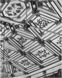 Keywords: talha portugal robert smith robert chester smith robertchestersmith porto ordem terceira de são francisco ordemterceiradesãofrancisco fundação calouste gulbenkian fundaçãocaloustegulbenkian casa do despacho casadodespacho biblioteca de arte bibliotecadearte Tecto apainelado. Autor: Robert Chester Smith (1912-1975). Data de produção da fotografia original: 1962-1964. Obra de Nicolau Nasoni, por encomenda da Mesa da Ordem de São Francisco, a construção da Casa do Despacho foi francamente rápida, tendo decorrido em apenas três anos (1747-1749), embora alguns indicadores apontem para uma conclusão mais tardia, já em 1752. O projecto então levado a cabo contou com a colaboração de nomes marcantes da arte barroca do Porto, não apenas com o concurso de Nasoni, mas com o de José Martins Tinoco, responsável pela pintura do tecto da Sala do Despacho, datado de 1748, e com o de José Teixeira Guimarães, que executou o retábulo. O cemitério, que acompanhou a construção do imóvel, foi a última parte a ser concluída, tendo sido responsável o pedreiro António da Silva Carvalho. A Casa do Despacho segue uma tipologia de edifício em dois pisos, de planta rectangular, ocupando as salas principais o segundo piso. Particularmente marcante, é a Sala das Sessões, com tecto pintado e retábulo e outras pinturas avulsas dispostas nas paredes. O tecto, de planta octogonal, é formado por caixotões e inclui incrustrações de talha. Um terceiro piso, subterrâneo, foi destinado a cemitério da Ordem, que serviu durante pouco tempo, até ser substituído por outro, na viragem para o século XIX. (Fonte: IPPAR) [CFT008.1365.ic] Tecto apainelado. Autor: Robert Chester Smith (1912-1975). Data de produção da fotografia original: 1962-1964. Obra de Nicolau Nasoni, por encomenda da Mesa da Ordem de São Francisco, a construção da Casa do Despacho foi francamente rápida, tendo decorrido em apenas três anos (1747-1749), embora alguns indicadores apontem para uma conclusão mais tardia, já em 1752. O projecto então levado a cabo contou com a colaboração de nomes marcantes da arte barroca do Porto, não apenas com o concurso de Nasoni, mas com o de José Martins Tinoco, responsável pela pintura do tecto da Sala do Despacho, datado de 1748, e com o de José Teixeira Guimarães, que executou o retábulo. O cemitério, que acompanhou a construção do imóvel, foi a última parte a ser concluída, tendo sido responsável o pedreiro António da Silva Carvalho. A Casa do Despacho segue uma tipologia de edifício em dois pisos, de planta rectangular, ocupando as salas principais o segundo piso. Particularmente marcante, é a Sala das Sessões, com tecto pintado e retábulo e outras pinturas avulsas dispostas nas paredes. O tecto, de planta octogonal, é formado por caixotões e inclui incrustrações de talha. Um terceiro piso, subterrâneo, foi destinado a cemitério da Ordem, que serviu durante pouco tempo, até ser substituído por outro, na viragem para o século XIX. (Fonte: IPPAR) [CFT008.1365.ic]