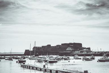 Keywords: castle guernsey history black and white boats dramatic sky heritage landmark castle cornet
