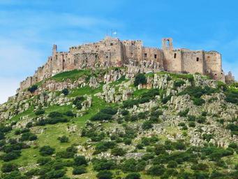 Keywords: castle hilltop ancient architecture sprawling old spain historical mountain stone fortress medieval hillside