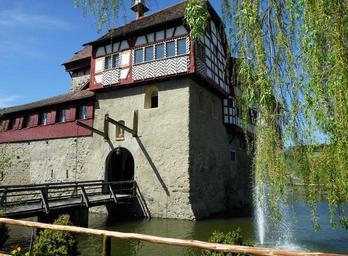 Keywords: castle moated castle drawbridge inn water willow tree places of interest historically truss tourist attraction hagenwil amriswil thurgau switzerland