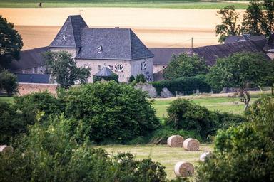 Keywords: castle reiterhof fields burg holzheim lowland castle hay bales straw bales langerwehe germany