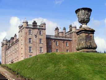 Keywords: castle urn grass old red sandstone garden classic building gentry towers historical scotland hill bank sky clouds wealth