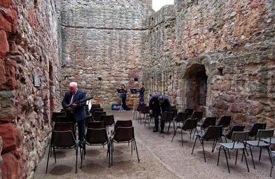 Keywords: castle wedding ceremony marriage location music violins wedding ceremony people chairs seating aisle violinist