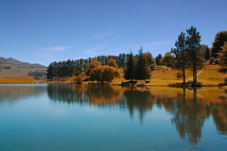 Keywords: castleburn lake drakensberg mountains pine tree water blue view scenic reflection nature outdoors tranquil peaceful landscape countryside