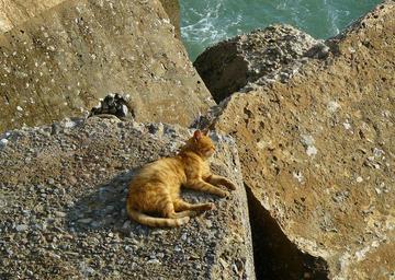 Keywords: cat animal pet animal world mammal tiger cat red mackerel tabby mackerel sleep relax concerns stones rock sea coast sun rest outdoor sunbathing chill out doze