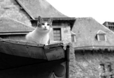 Keywords: cat animal pet animals portrait climb sit attention roof roofs building architecture house roof black and white black and white photo
