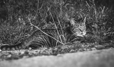 Keywords: cat animal pet grey cute black and white wild nature natural grass meadow outdoors flora garden wildlife