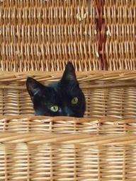 Keywords: cat basket black curious attention hidden