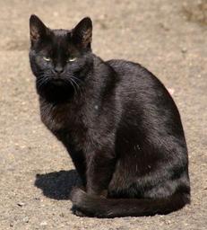 Keywords: cat black cat animal black eyes staring kitty photo image pose sit sitting pet fur feline portrait