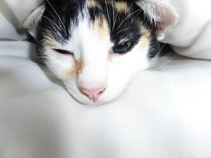 Keywords: cat black white snuggle tired whiskers cute charming three coloured lucky cat
