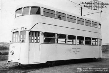 | Keywords: C.T.C.B.A. (Imperial en Riachuelo).jpg es Tranvía de doble piso argentino tipo Imperial circulando en las cercanías del Riachuelo en Buenos Aires 1942 Institution Asociación Amigos del Tranvía C T C B A Catita Imperial 2 png watermark Custom license marker 2014 08 11 PD-AR-Photo Black and white photographs of trams Files provided by the Asociación Amigos del Tranvía Uploaded with UploadWizard Catita Imperial Number 371 on trams Trams facing left Trams on route 1 1942 in tram transport | ||||