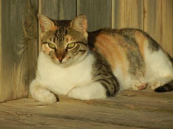 Keywords: cat calico feline fur mammal tricolor eyes furry alone wood rest animal face