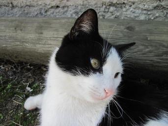 Keywords: cat curious cat's eyes animal attention domestic cat pet outdoor black and white focused