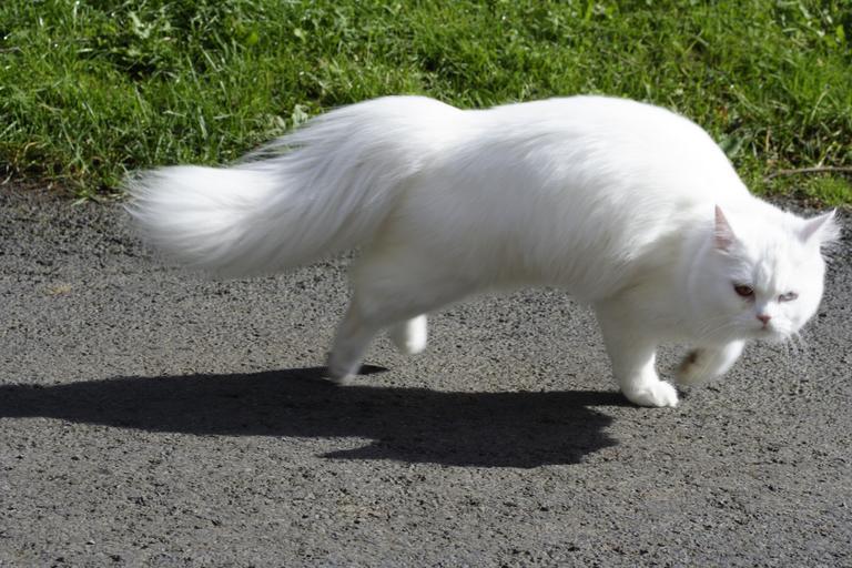 Keywords: cat domestic cat european shorthair sweet dear persian cat breed cat white sit nature green shrubs tree rush grass road away race run move escape felidae