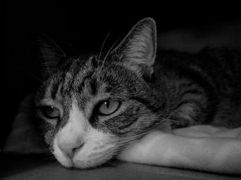 Keywords: cat face portrait pet domestic feline cute eyes head close up looking resting kitty furry indoors book bored tabby