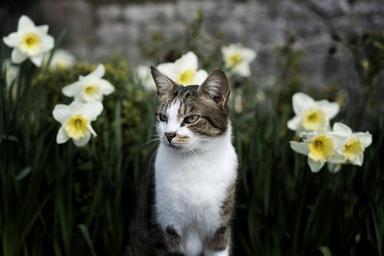 Keywords: cat feline looking cute sitting flowers daffodils outdoors animal garden domestic curious pet fur portrait adorable sweet head whiskers eyes ears face