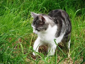 Keywords: cat grass kitten tiger cat grey tabby hunting