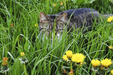 Keywords: cat grass kitten young cat domestic cat animal graugetiegert close up view mieze meadow flower