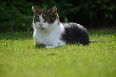 Keywords: cat grass pet black white tabby domestic cute animal feline kitty mammal funny fur small paw young adorable tail green hair soft