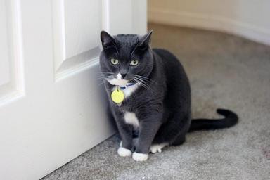 Keywords: cat gray cute pet animal domestic lazy kitty white overweight tuxedo cat door doorway