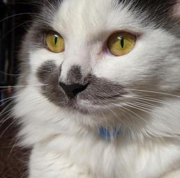 Keywords: cat head face macro close up looking gray and white domestic pet mammal fur feline portrait animal symbol whiskers nose eyes